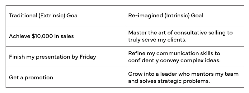 The focus shifts from the result to the identity. Instead of focusing on getting a promotion (extrinsic), you focus on growing into a leader who mentors their team and solves strategic problems (intrinsic).